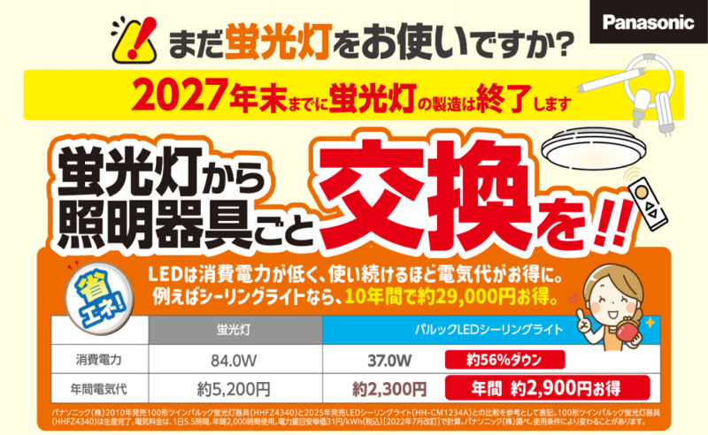 以前のニュースでもお知らせしましたが、蛍光灯ランプは2027年末までに生産と輸出入が終了することが決まっています。すぐになくなるわけではありませんが、店頭から少しずつ在庫が減っていくことが予想されます。